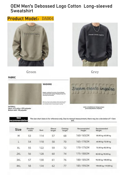 Long-Sleeved Sweatshirt (DA004): Made from 61% cotton + 39% polyester for comfort and durability.